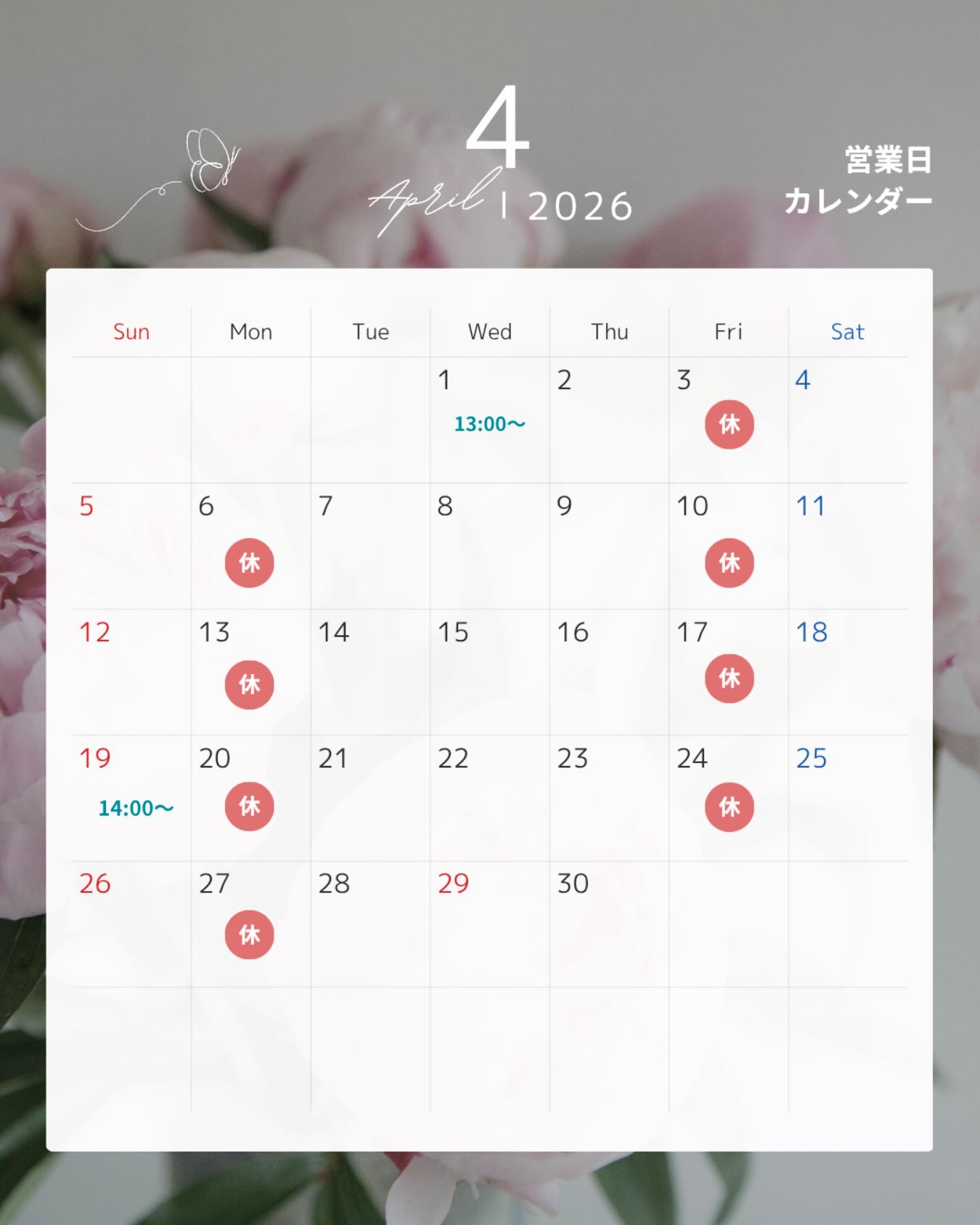 ・4/1(水)13:00〜 ・4/19(日)14:00〜